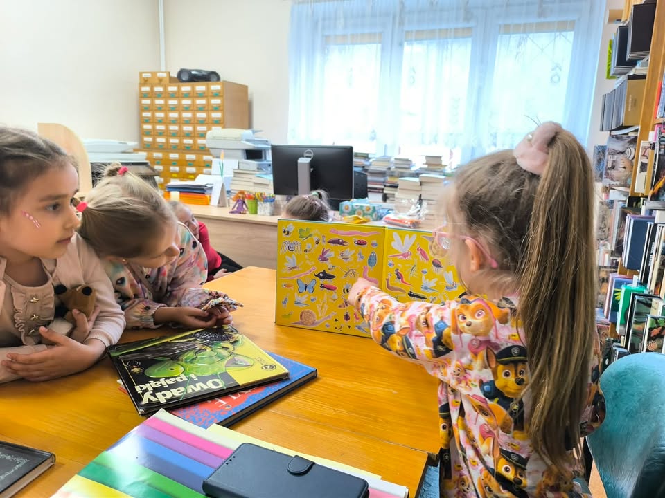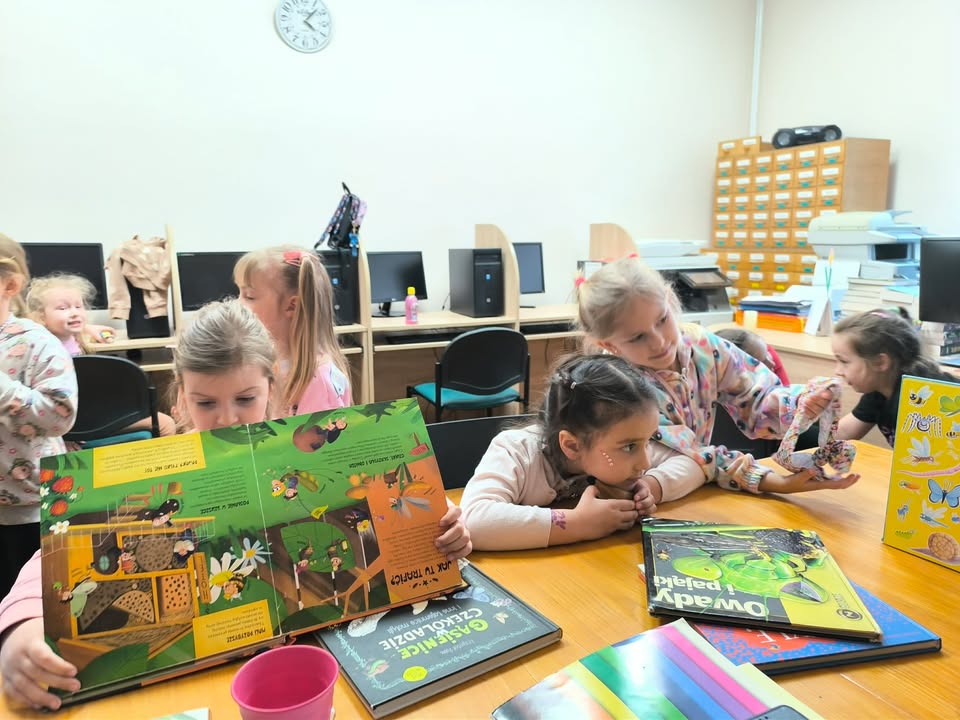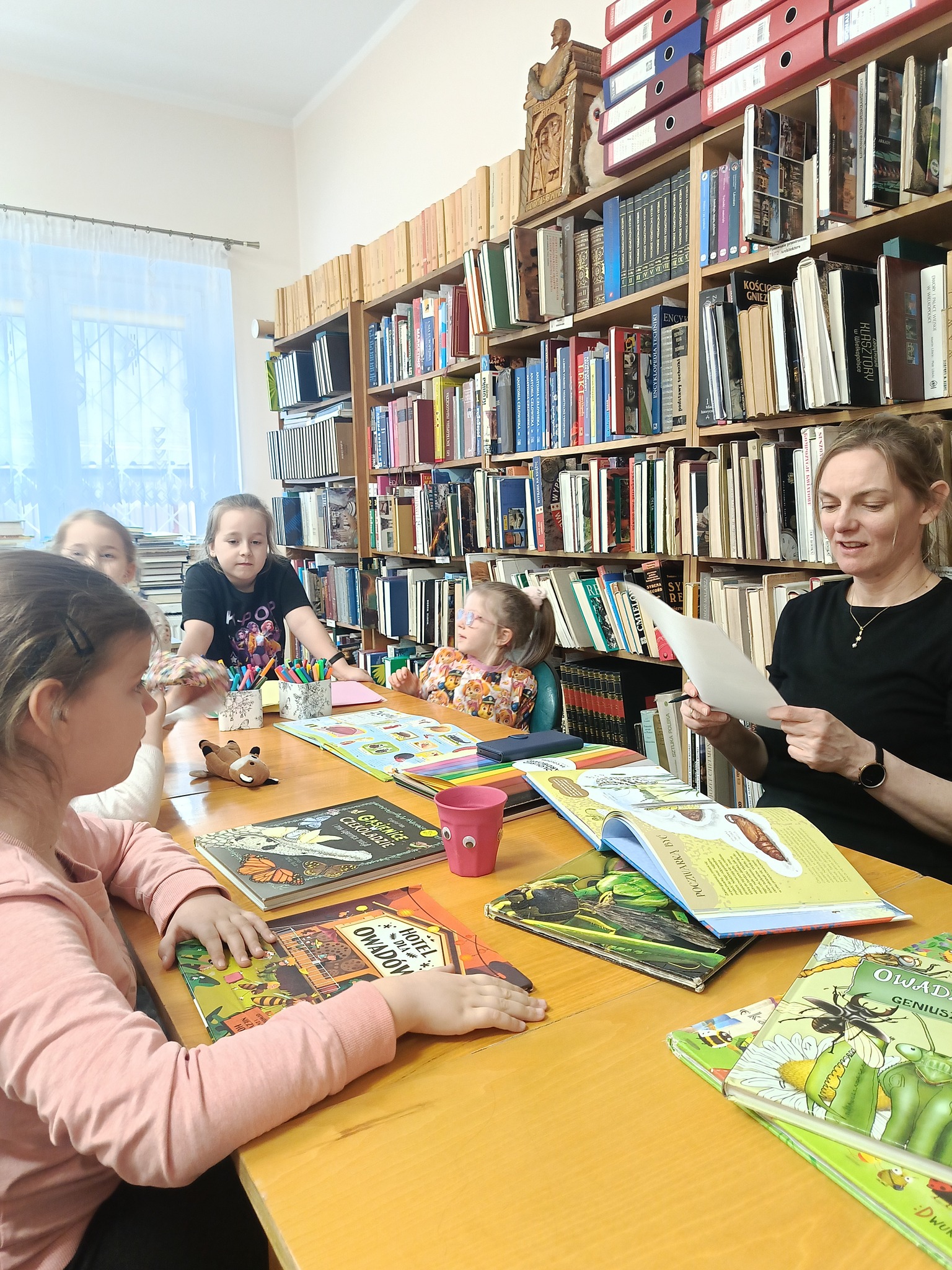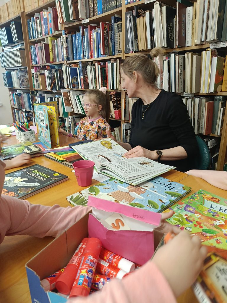 Podczas popołudniowego spotkania z pomocą takich tytułów jak „Nie tylko robale” M. Robertson, „Motyle dzienne i nocne” I. Dziekańska oraz „Owadziarium czyli Geniusz owadów” K.Pabis rozmawialiśmy o pierwszych wiosennych owadach, które budzą się po zimie.