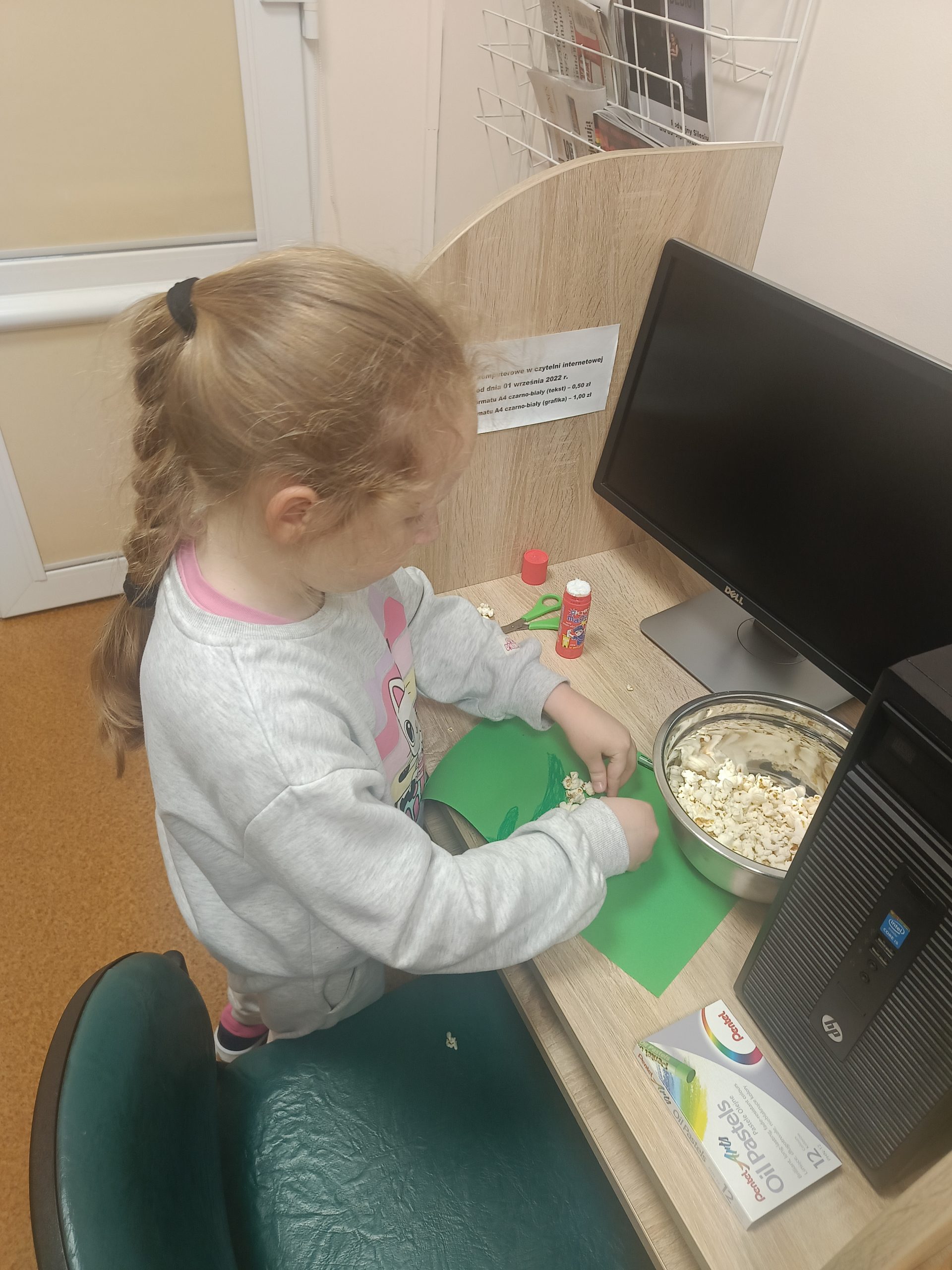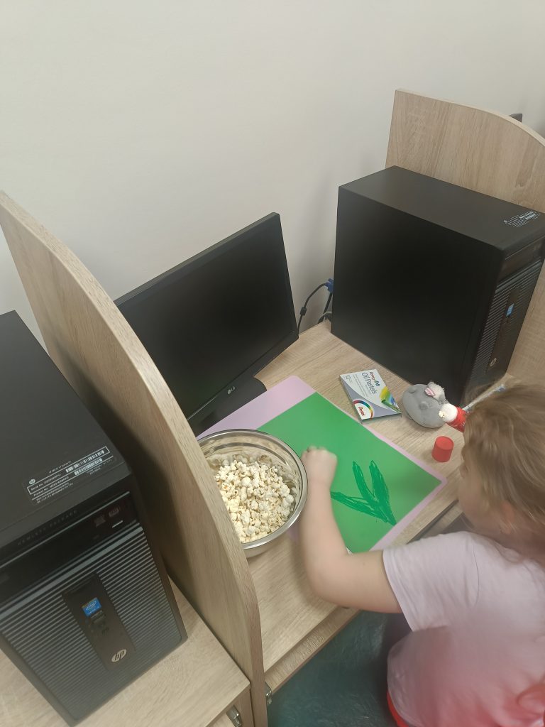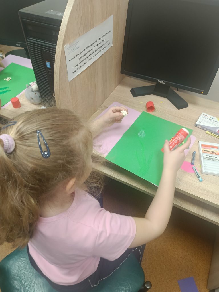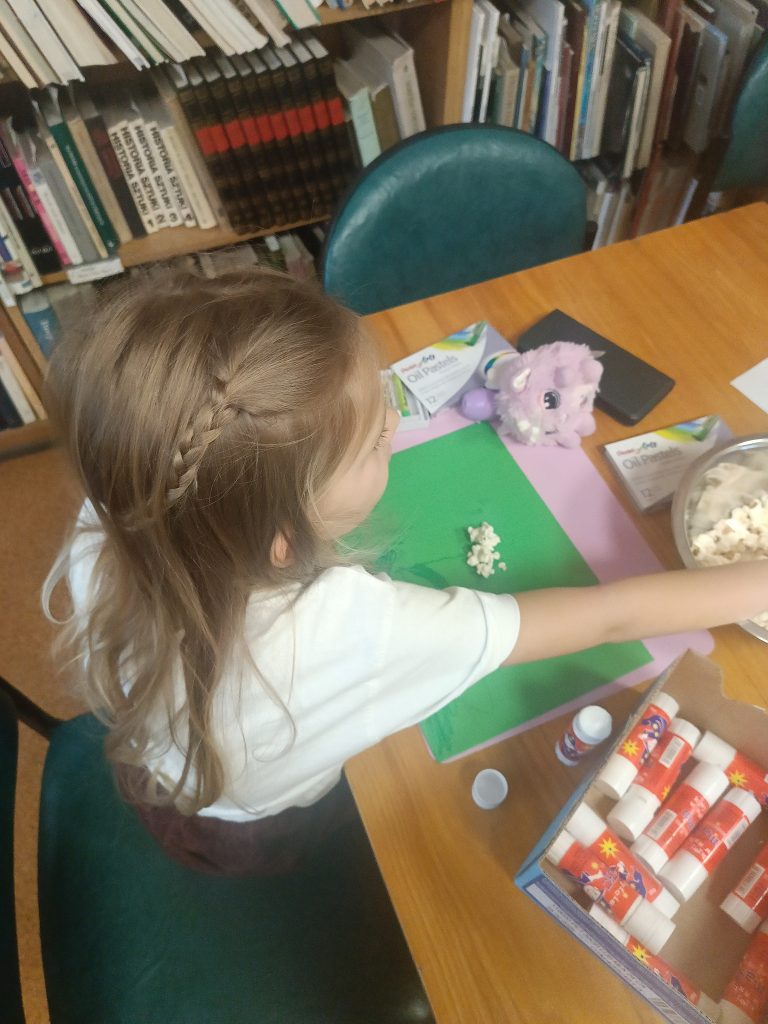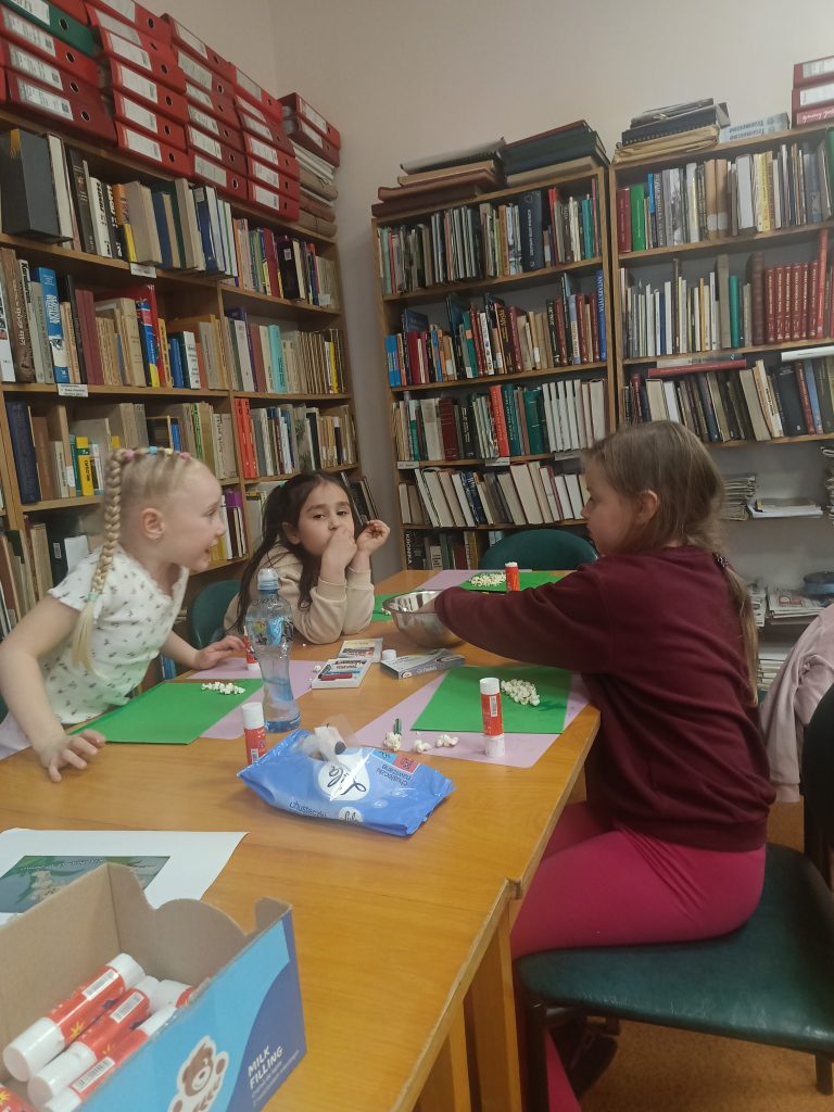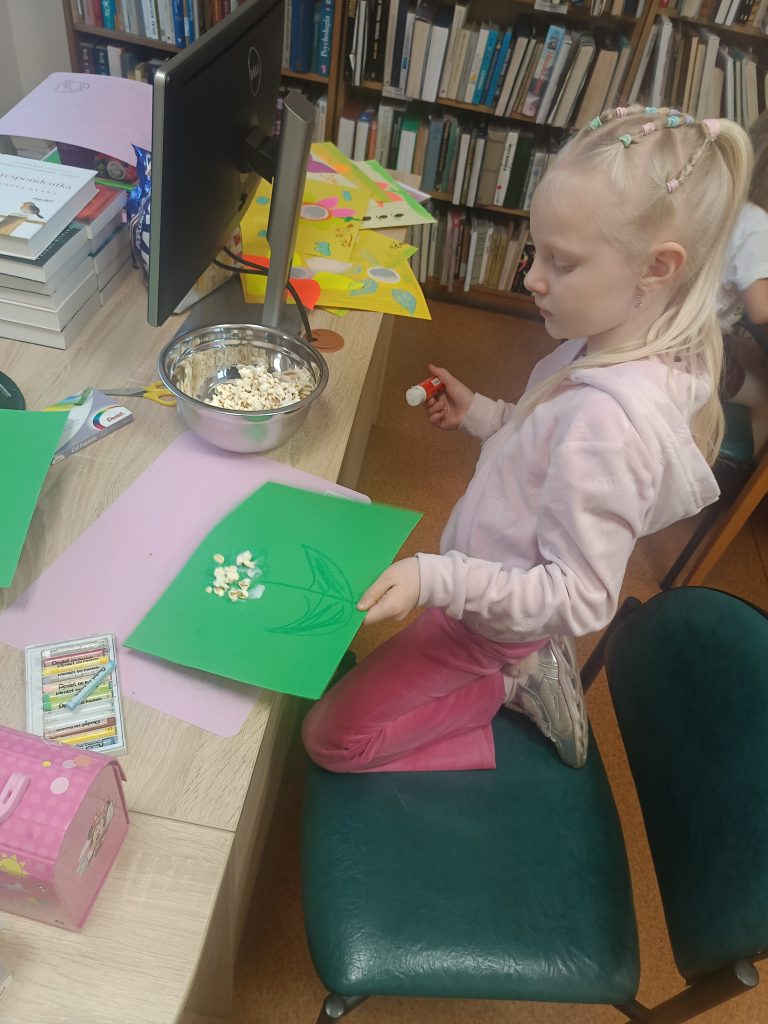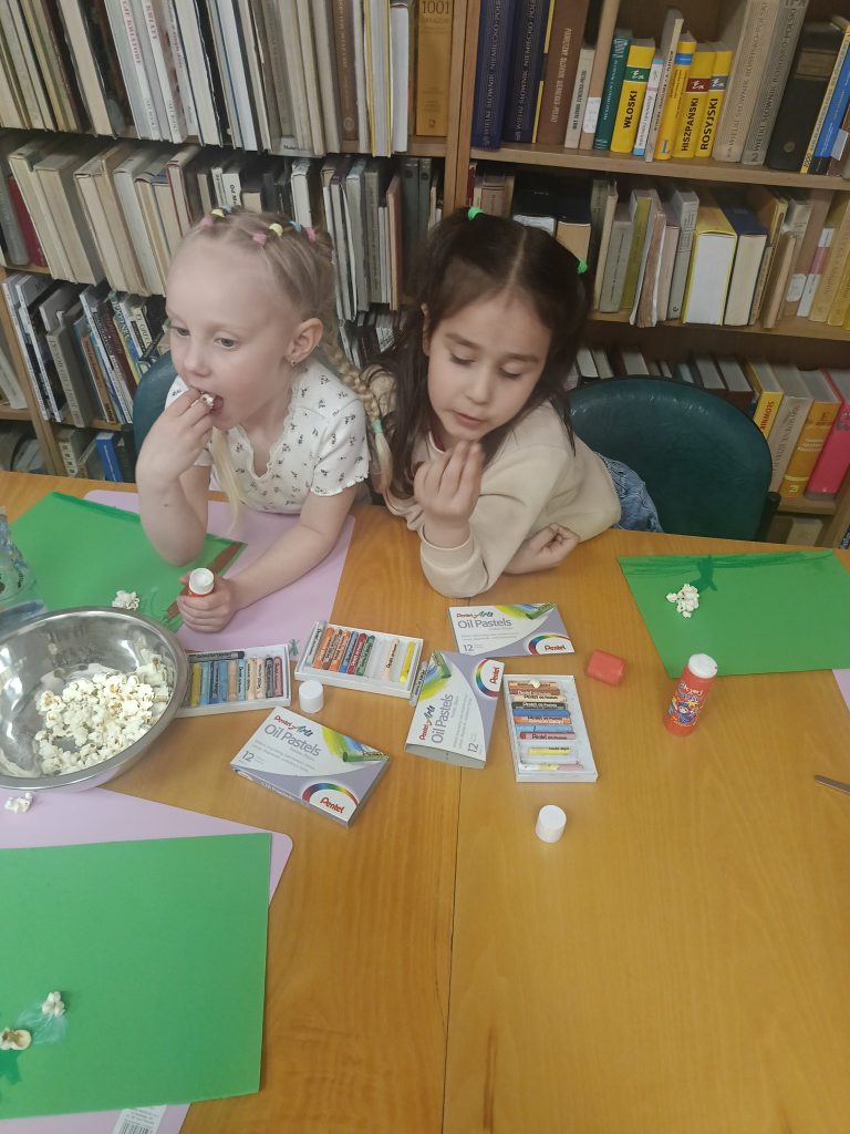 Na zakończenie spotkania stworzyliśmy wyjątkowe prace – hiacynty z popcornu oraz kolorowe kwiaty!